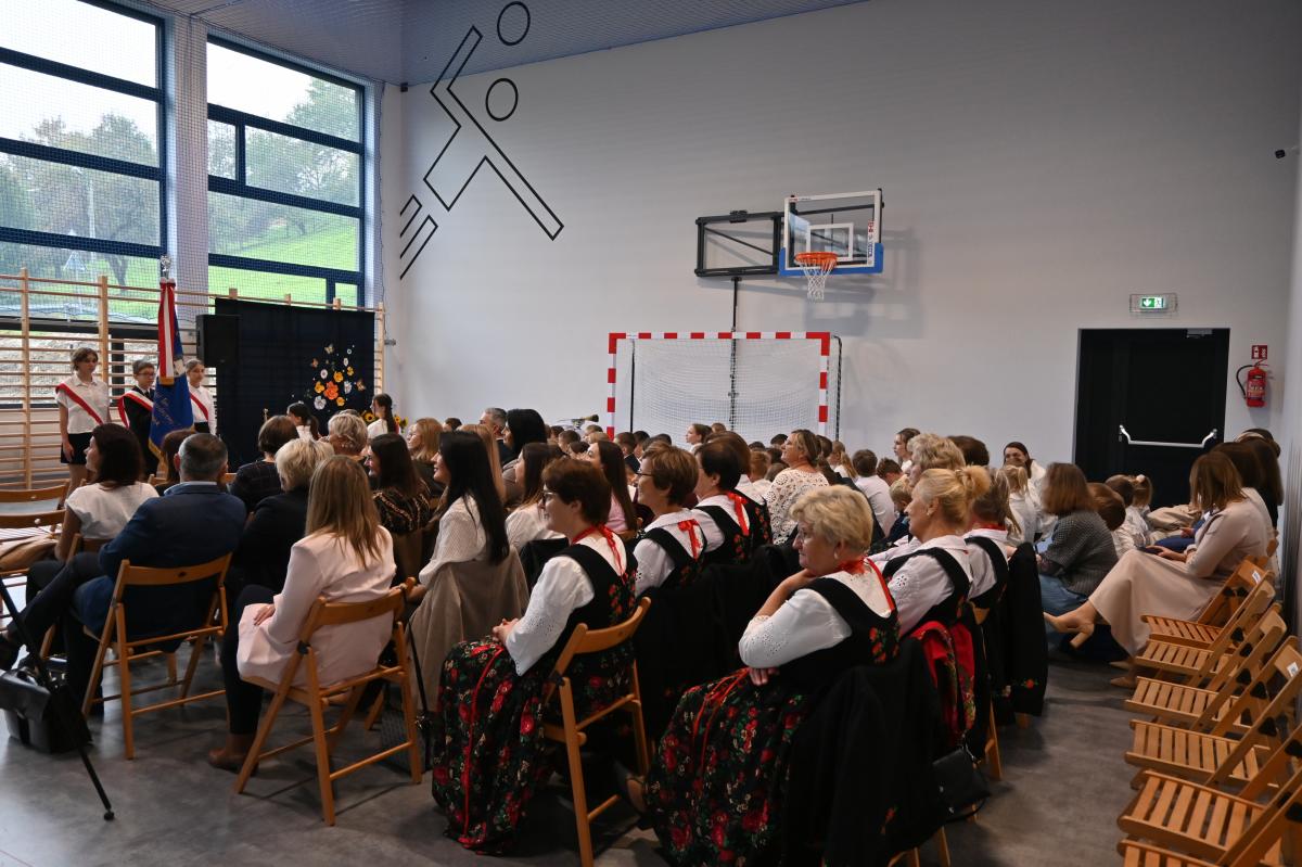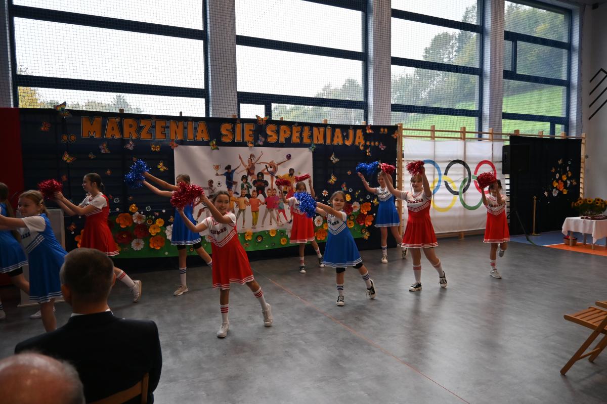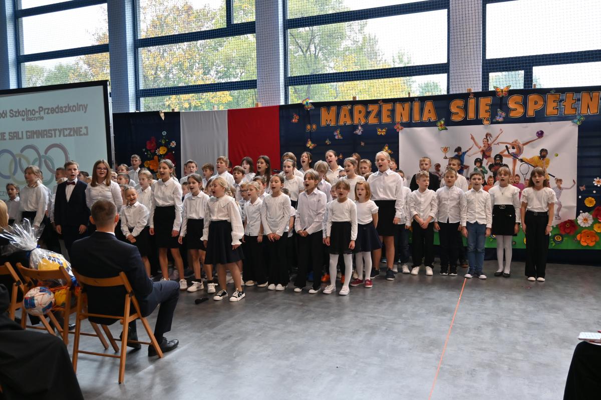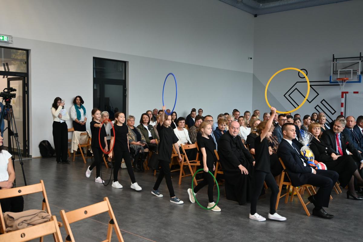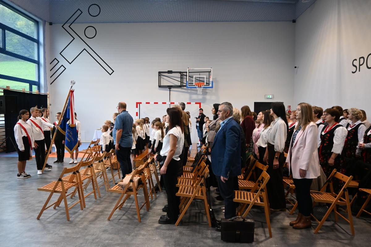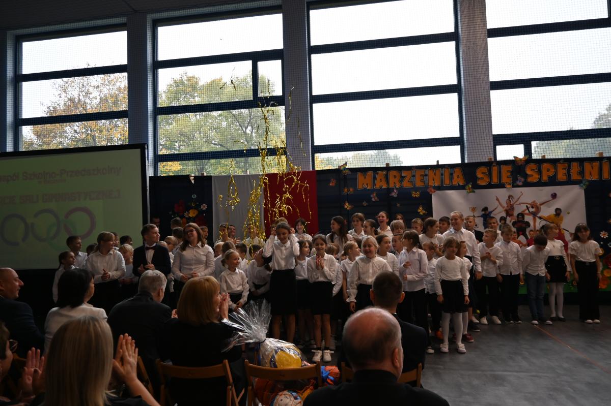 Cała społeczność szkolna czekała na ten moment. Nowa sala gimnastyczna jest oficjalnie otwarta! Czwartek 9 października 2025 roku zgromadził w naszej szkole wielu znakomitych gości. Zaszczycili nas swoją obecnością: pan Krzysztof Klęczar - wojewoda małopolski, pan Artur Pasek - pierwszy Małopolski Wicekurator Oświaty, pani Danuta Kawa - Radna Sejmiku województwa małopolskiego, pan Maksymilian Głowacz - Powiatowy Inspektor Nadzoru Budowlanego, pan Jan Najdek - Wójt Gminy Budzów, pani Janina Pieronkiewicz - sekretarz gminy Budzów, pani Kamila Nitecka przewodnicząca Rady Gminy, pan Maciej Krzyśków – Główny Specjalista w Wydziale Promocji, Kultury, Sportu i Funduszy, ks. Zbigniew Kaleciak - proboszcz parafii Budzów, ks. Piotr Derendal- wikariusz, sołtysi okolicznych wsi, pan Adam Liszka - wieloletni sołtys naszej wsi, radni powiatowi i gminni, zarząd OSP Baczyn oraz przedstawicielki KGW, dyrektorzy szkół podstawowych i przedszkoli samorządowych, pan Artur Świerkosz - wykonawca, a także rodzice i absolwenci. W części oficjalnej uroczystości Pani Dyrektor Teresa Gaura przywitała wszystkich zgromadzonych oraz wygłosiła piękne przemówienie. Ksiądz probosz poświęcił obiekt, a zaproszeni goście przecięli wstęgę. Później głos zabrali zaproszeni goście. Ostatnim punktem części oficjalnej było wprowadzenie flagi olimpijskiej oraz złożenie ślubowania przez przedstawicieli poszczególnych klas. Cześć artystyczną rozpoczęły prowadzące - Natalia i Julia, które sprawdziły się świetnie w roli konferansjerów. Następnie odbyły się prezentacje dyscyplin - akrobatyka, siatkówka, karate, piłka nożna, gimnastyka, poprzeplatane pięknymi rytmicznymi piosenkami. Występ uwieńczyła autorska piosenka, którą wykonali wszyscy uczniowie. Oczywiście był też czas na podziękowania, wpisy do księgi pamiątkowej oraz rozmowy.