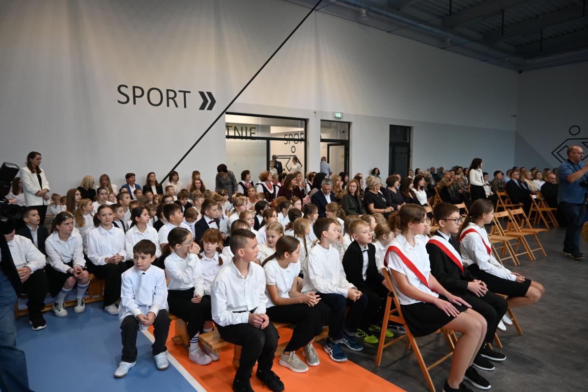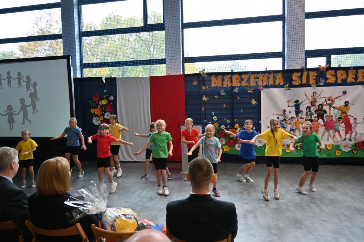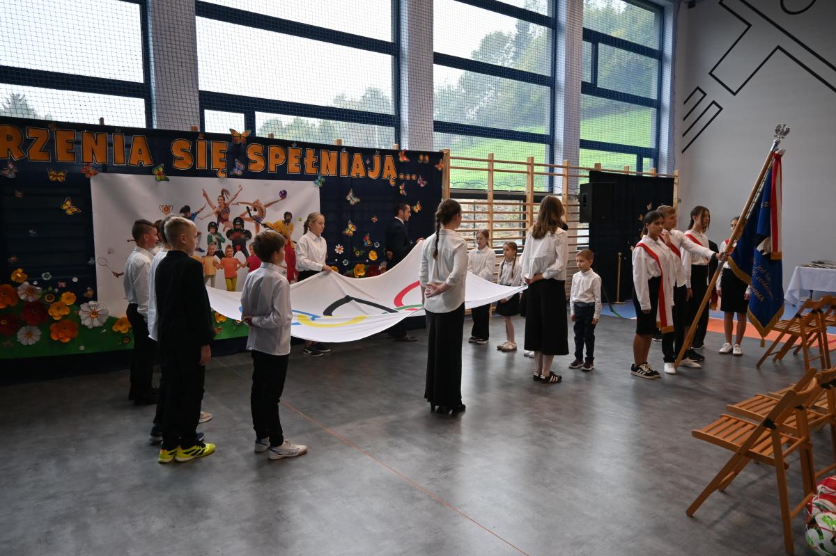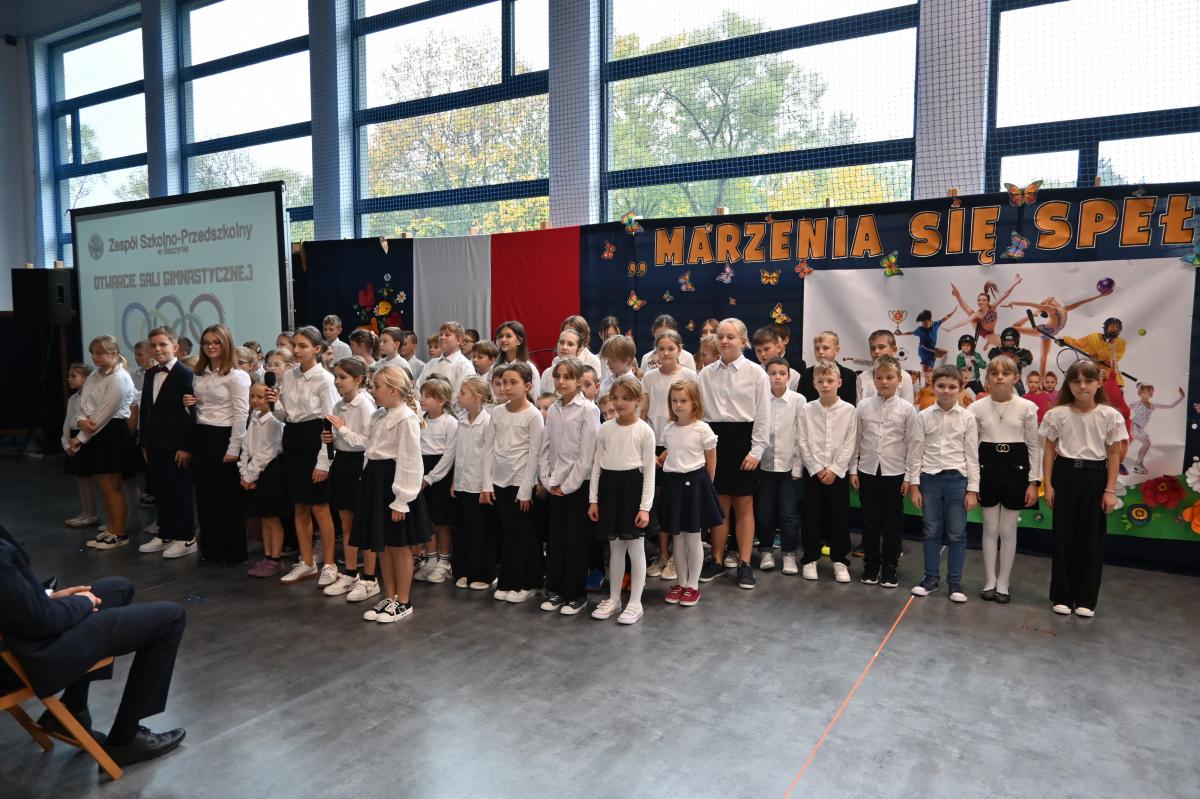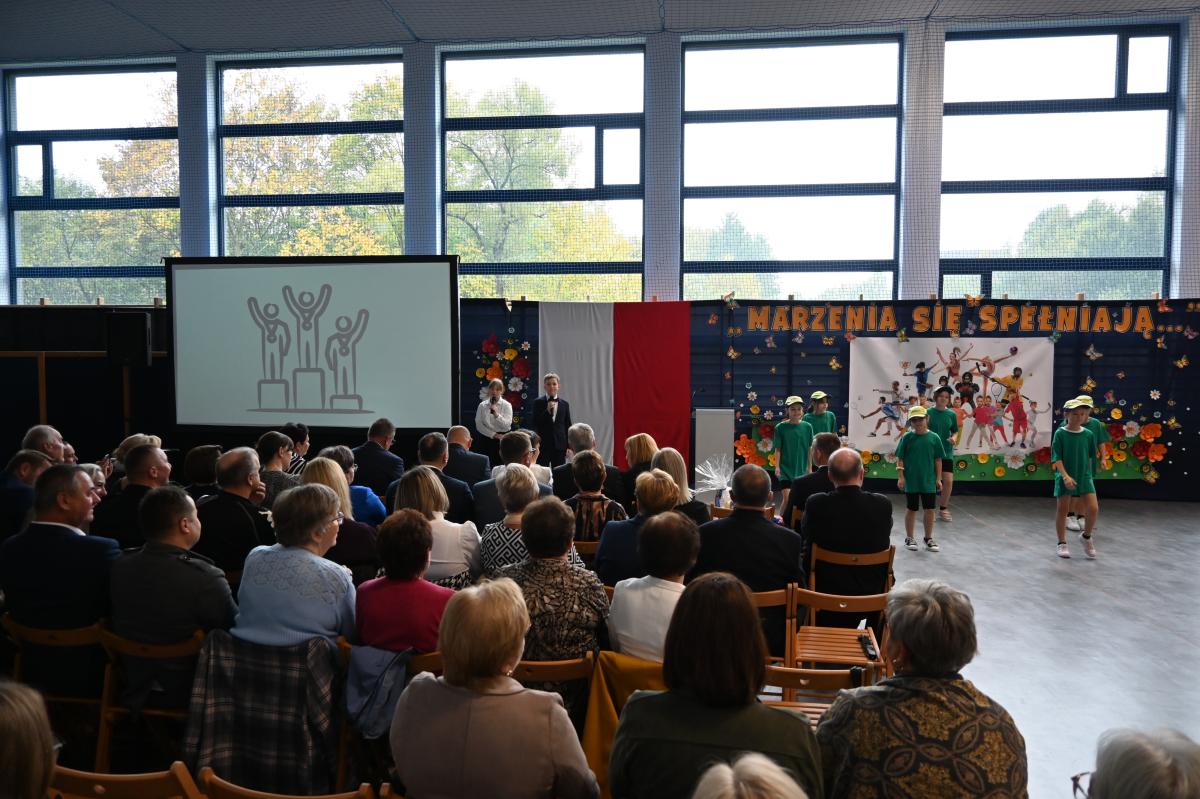 Cała społeczność szkolna czekała na ten moment. Nowa sala gimnastyczna jest oficjalnie otwarta! Czwartek 9 października 2025 roku zgromadził w naszej szkole wielu znakomitych gości. Zaszczycili nas swoją obecnością: pan Krzysztof Klęczar - wojewoda małopolski, pan Artur Pasek - pierwszy Małopolski Wicekurator Oświaty, pani Danuta Kawa - Radna Sejmiku województwa małopolskiego, pan Maksymilian Głowacz - Powiatowy Inspektor Nadzoru Budowlanego, pan Jan Najdek - Wójt Gminy Budzów, pani Janina Pieronkiewicz - sekretarz gminy Budzów, pani Kamila Nitecka przewodnicząca Rady Gminy, pan Maciej Krzyśków – Główny Specjalista w Wydziale Promocji, Kultury, Sportu i Funduszy, ks. Zbigniew Kaleciak - proboszcz parafii Budzów, ks. Piotr Derendal- wikariusz, sołtysi okolicznych wsi, pan Adam Liszka - wieloletni sołtys naszej wsi, radni powiatowi i gminni, zarząd OSP Baczyn oraz przedstawicielki KGW, dyrektorzy szkół podstawowych i przedszkoli samorządowych, pan Artur Świerkosz - wykonawca, a także rodzice i absolwenci. W części oficjalnej uroczystości Pani Dyrektor Teresa Gaura przywitała wszystkich zgromadzonych oraz wygłosiła piękne przemówienie. Ksiądz probosz poświęcił obiekt, a zaproszeni goście przecięli wstęgę. Później głos zabrali zaproszeni goście. Ostatnim punktem części oficjalnej było wprowadzenie flagi olimpijskiej oraz złożenie ślubowania przez przedstawicieli poszczególnych klas. Cześć artystyczną rozpoczęły prowadzące - Natalia i Julia, które sprawdziły się świetnie w roli konferansjerów. Następnie odbyły się prezentacje dyscyplin - akrobatyka, siatkówka, karate, piłka nożna, gimnastyka, poprzeplatane pięknymi rytmicznymi piosenkami. Występ uwieńczyła autorska piosenka, którą wykonali wszyscy uczniowie. Oczywiście był też czas na podziękowania, wpisy do księgi pamiątkowej oraz rozmowy.