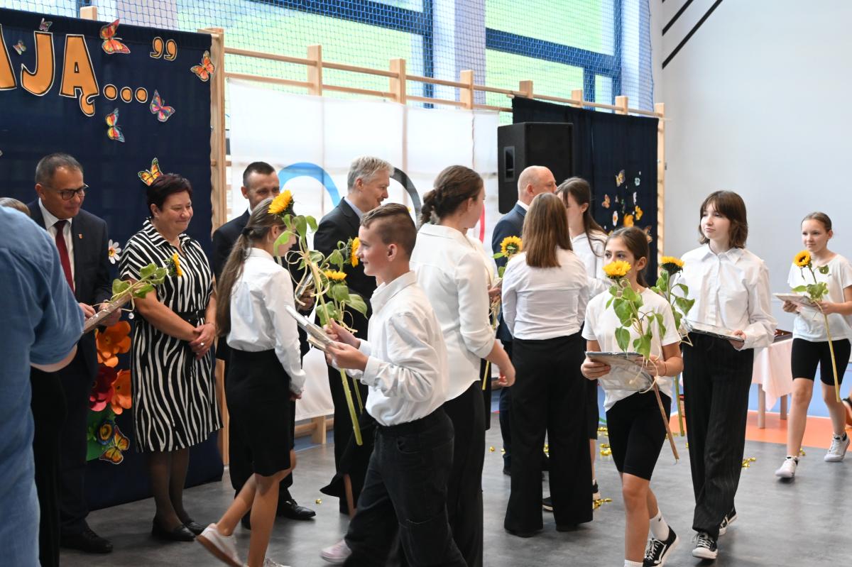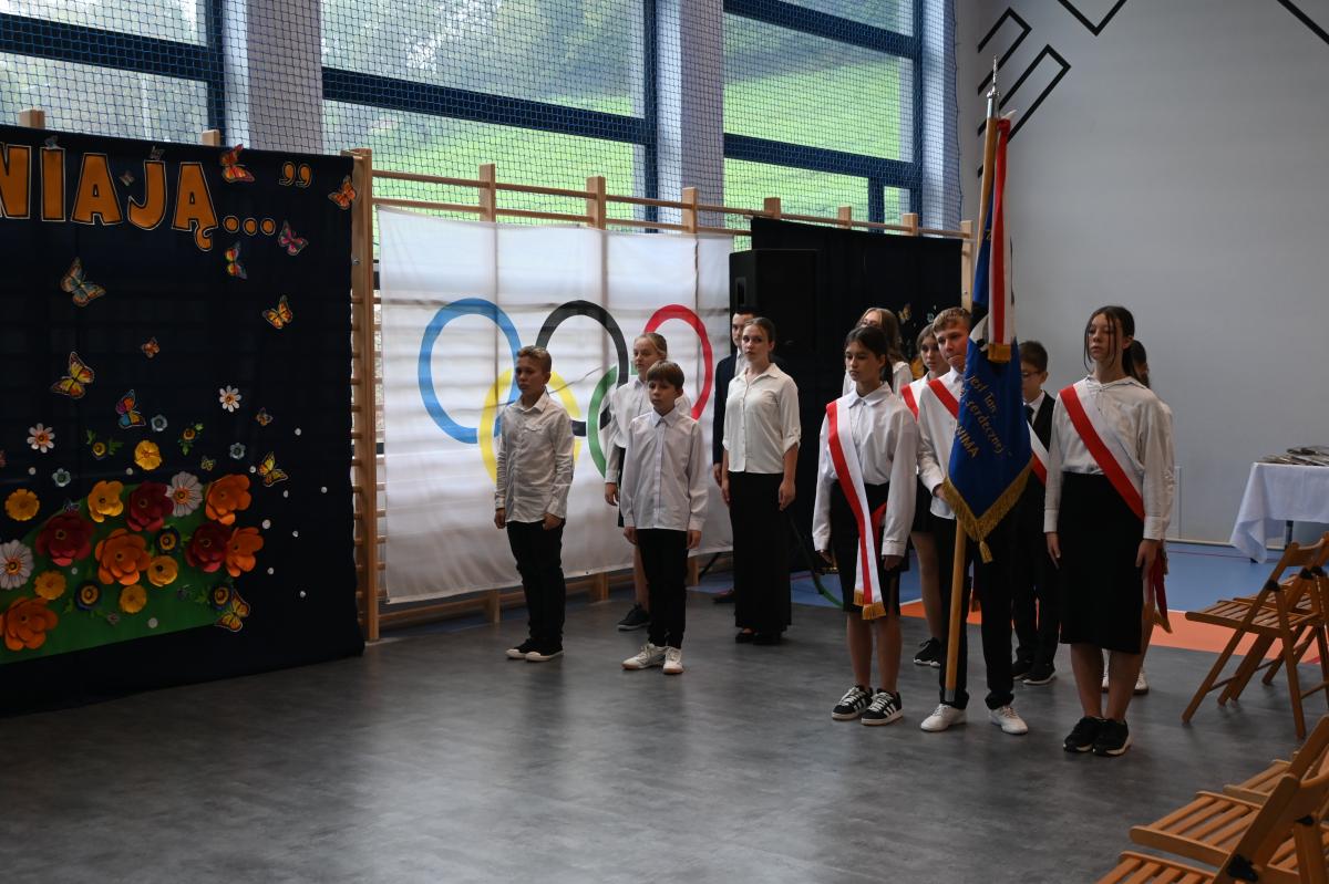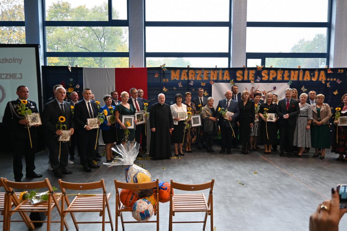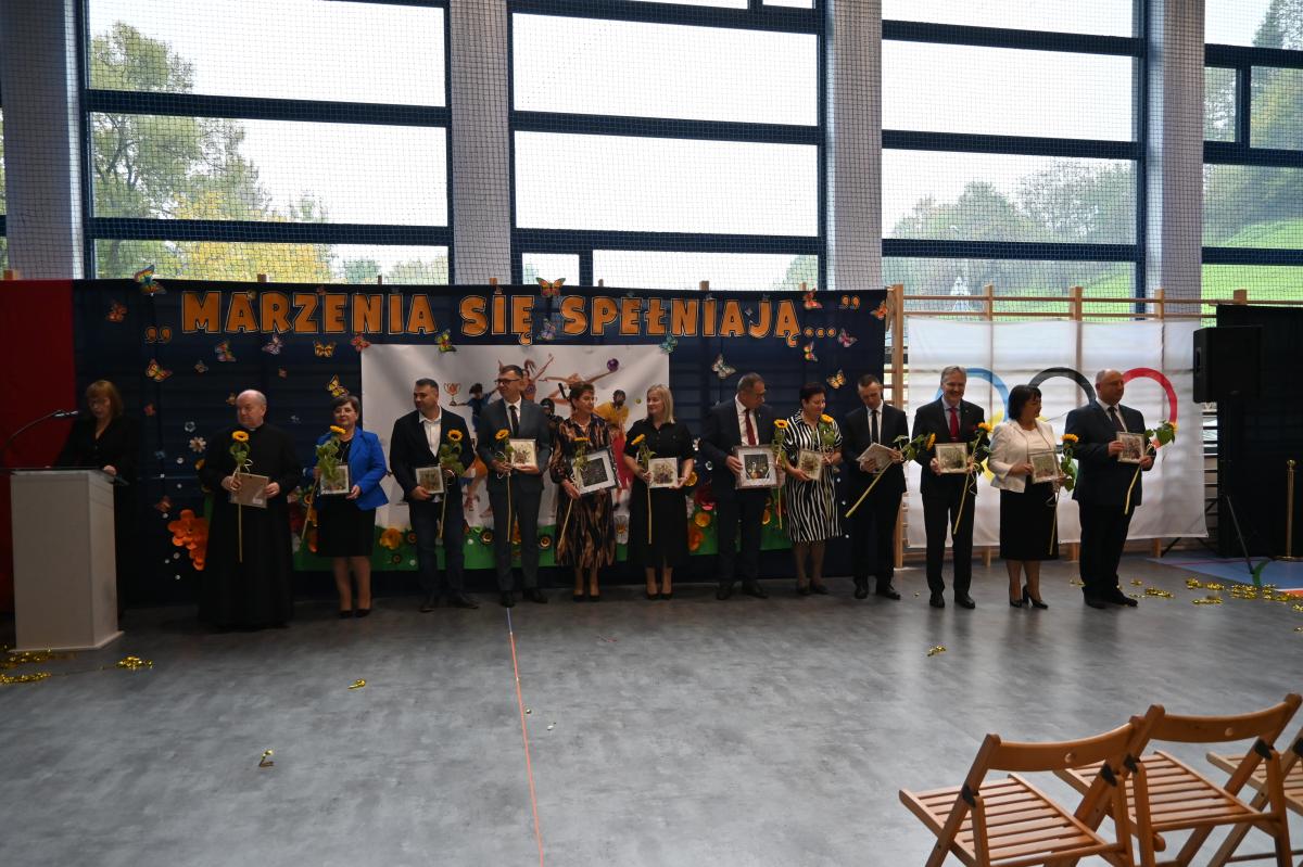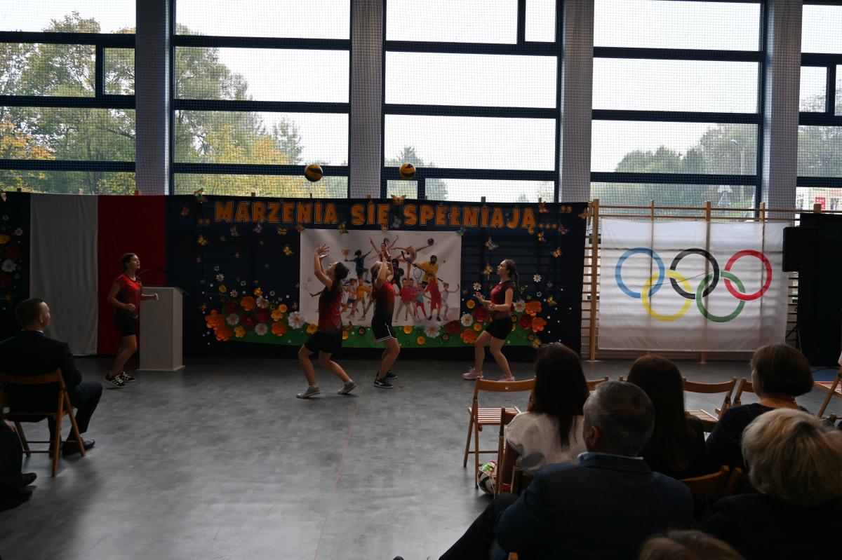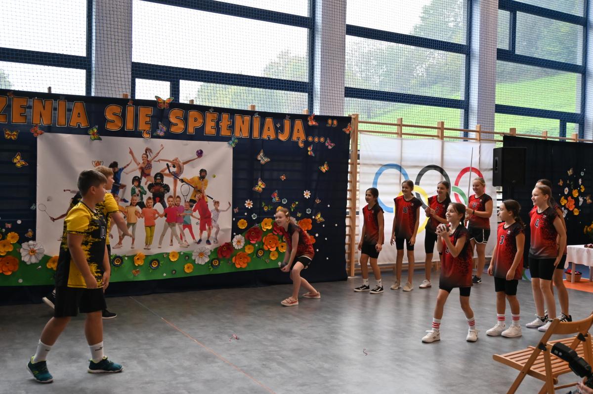 Cała społeczność szkolna czekała na ten moment. Nowa sala gimnastyczna jest oficjalnie otwarta! Czwartek 9 października 2025 roku zgromadził w naszej szkole wielu znakomitych gości. Zaszczycili nas swoją obecnością: pan Krzysztof Klęczar - wojewoda małopolski, pan Artur Pasek - pierwszy Małopolski Wicekurator Oświaty, pani Danuta Kawa - Radna Sejmiku województwa małopolskiego, pan Maksymilian Głowacz - Powiatowy Inspektor Nadzoru Budowlanego, pan Jan Najdek - Wójt Gminy Budzów, pani Janina Pieronkiewicz - sekretarz gminy Budzów, pani Kamila Nitecka przewodnicząca Rady Gminy, pan Maciej Krzyśków – Główny Specjalista w Wydziale Promocji, Kultury, Sportu i Funduszy, ks. Zbigniew Kaleciak - proboszcz parafii Budzów, ks. Piotr Derendal- wikariusz, sołtysi okolicznych wsi, pan Adam Liszka - wieloletni sołtys naszej wsi, radni powiatowi i gminni, zarząd OSP Baczyn oraz przedstawicielki KGW, dyrektorzy szkół podstawowych i przedszkoli samorządowych, pan Artur Świerkosz - wykonawca, a także rodzice i absolwenci. W części oficjalnej uroczystości Pani Dyrektor Teresa Gaura przywitała wszystkich zgromadzonych oraz wygłosiła piękne przemówienie. Ksiądz probosz poświęcił obiekt, a zaproszeni goście przecięli wstęgę. Później głos zabrali zaproszeni goście. Ostatnim punktem części oficjalnej było wprowadzenie flagi olimpijskiej oraz złożenie ślubowania przez przedstawicieli poszczególnych klas. Cześć artystyczną rozpoczęły prowadzące - Natalia i Julia, które sprawdziły się świetnie w roli konferansjerów. Następnie odbyły się prezentacje dyscyplin - akrobatyka, siatkówka, karate, piłka nożna, gimnastyka, poprzeplatane pięknymi rytmicznymi piosenkami. Występ uwieńczyła autorska piosenka, którą wykonali wszyscy uczniowie. Oczywiście był też czas na podziękowania, wpisy do księgi pamiątkowej oraz rozmowy.