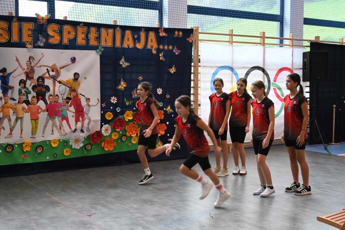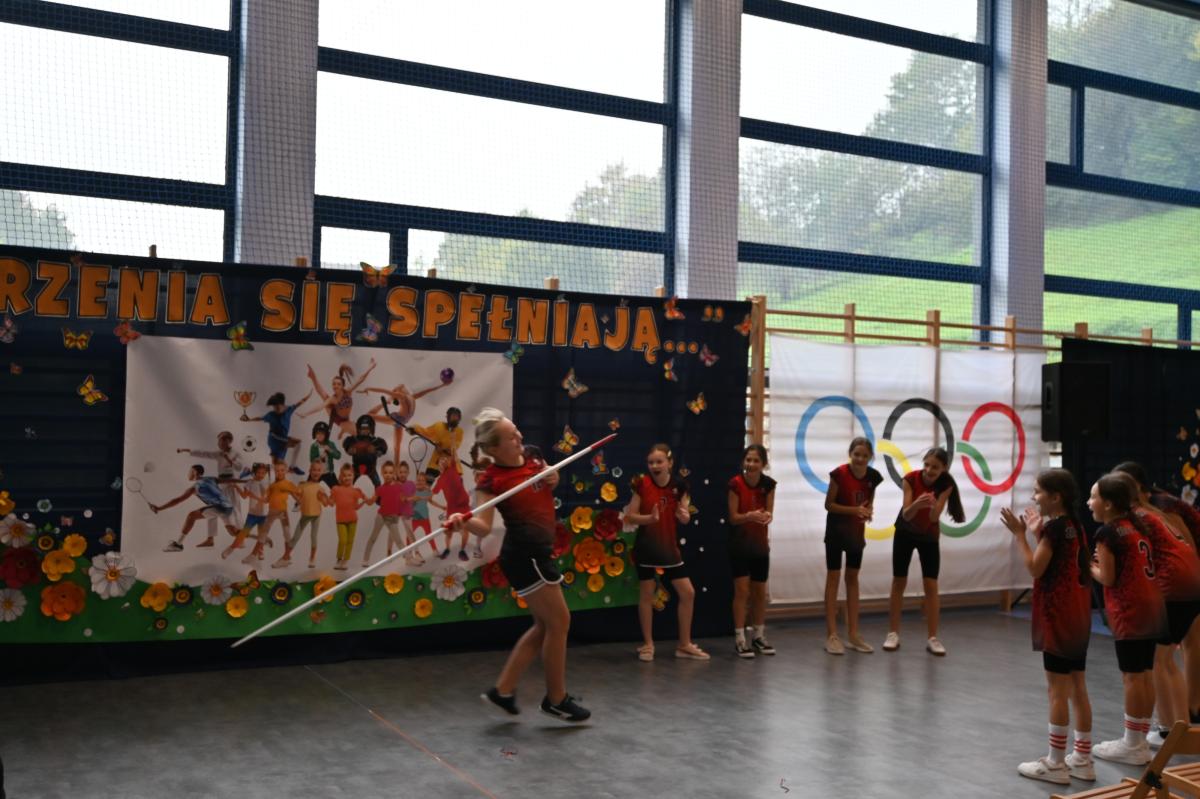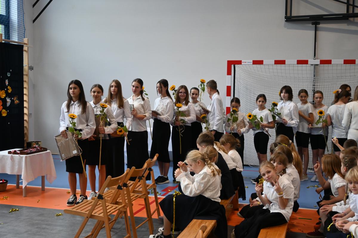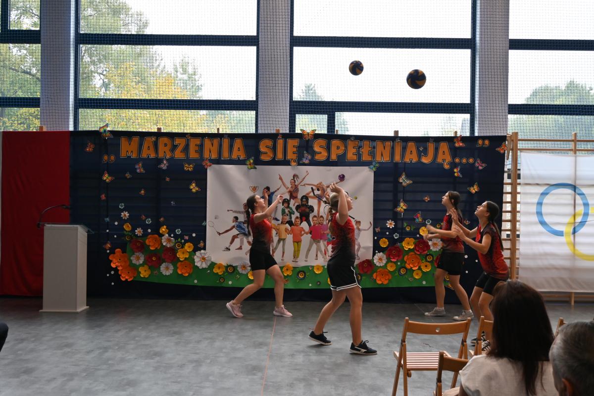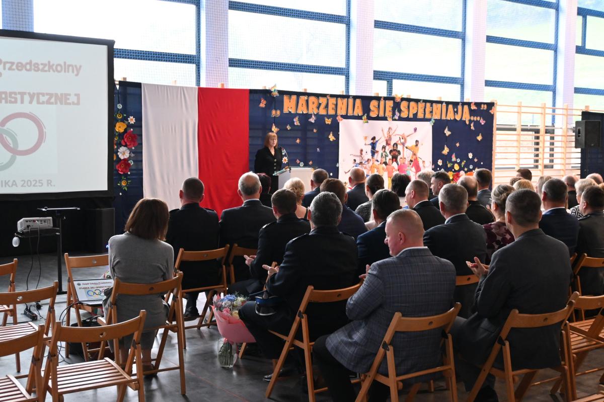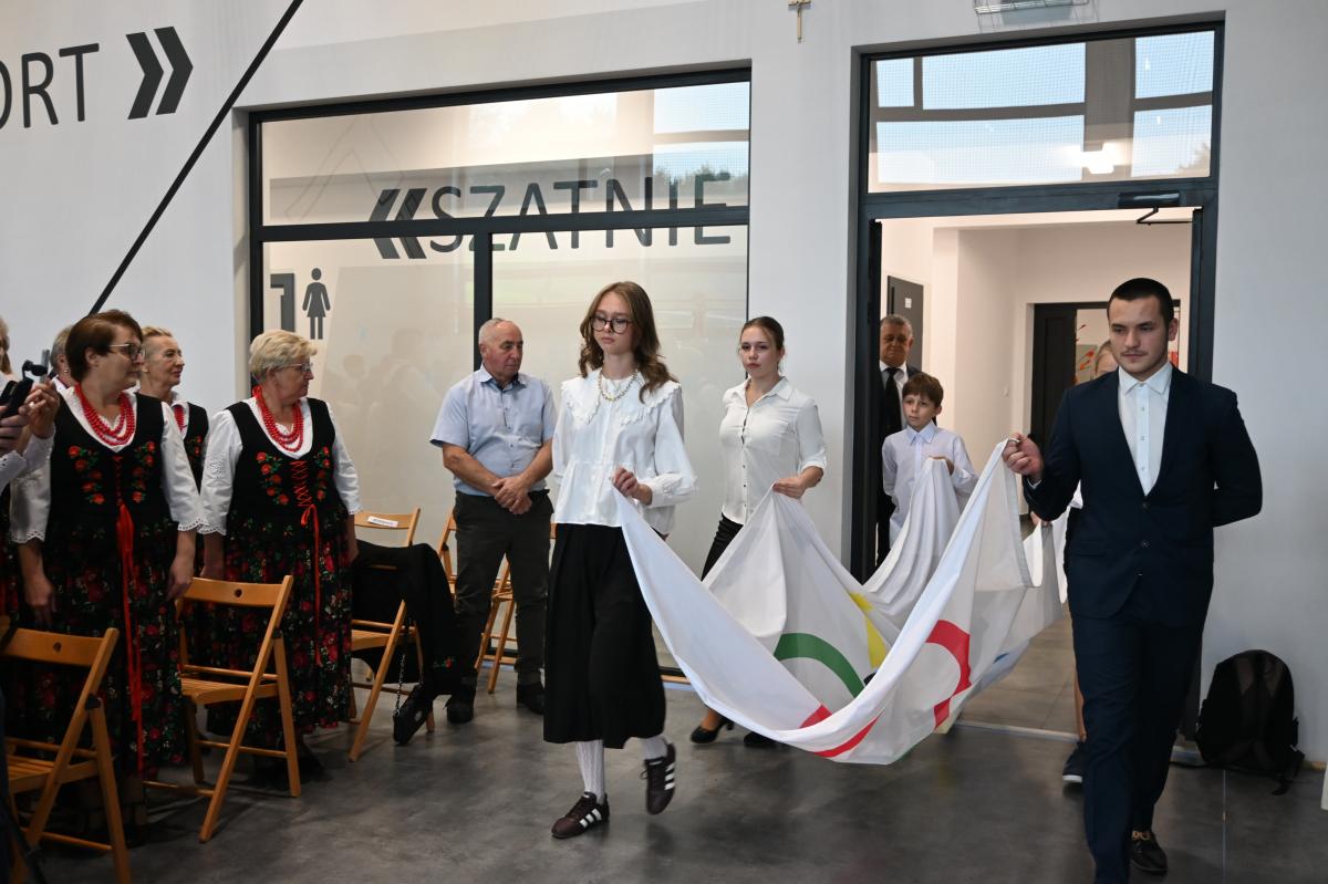 Cała społeczność szkolna czekała na ten moment. Nowa sala gimnastyczna jest oficjalnie otwarta! Czwartek 9 października 2025 roku zgromadził w naszej szkole wielu znakomitych gości. Zaszczycili nas swoją obecnością: pan Krzysztof Klęczar - wojewoda małopolski, pan Artur Pasek - pierwszy Małopolski Wicekurator Oświaty, pani Danuta Kawa - Radna Sejmiku województwa małopolskiego, pan Maksymilian Głowacz - Powiatowy Inspektor Nadzoru Budowlanego, pan Jan Najdek - Wójt Gminy Budzów, pani Janina Pieronkiewicz - sekretarz gminy Budzów, pani Kamila Nitecka przewodnicząca Rady Gminy, pan Maciej Krzyśków – Główny Specjalista w Wydziale Promocji, Kultury, Sportu i Funduszy, ks. Zbigniew Kaleciak - proboszcz parafii Budzów, ks. Piotr Derendal- wikariusz, sołtysi okolicznych wsi, pan Adam Liszka - wieloletni sołtys naszej wsi, radni powiatowi i gminni, zarząd OSP Baczyn oraz przedstawicielki KGW, dyrektorzy szkół podstawowych i przedszkoli samorządowych, pan Artur Świerkosz - wykonawca, a także rodzice i absolwenci. W części oficjalnej uroczystości Pani Dyrektor Teresa Gaura przywitała wszystkich zgromadzonych oraz wygłosiła piękne przemówienie. Ksiądz probosz poświęcił obiekt, a zaproszeni goście przecięli wstęgę. Później głos zabrali zaproszeni goście. Ostatnim punktem części oficjalnej było wprowadzenie flagi olimpijskiej oraz złożenie ślubowania przez przedstawicieli poszczególnych klas. Cześć artystyczną rozpoczęły prowadzące - Natalia i Julia, które sprawdziły się świetnie w roli konferansjerów. Następnie odbyły się prezentacje dyscyplin - akrobatyka, siatkówka, karate, piłka nożna, gimnastyka, poprzeplatane pięknymi rytmicznymi piosenkami. Występ uwieńczyła autorska piosenka, którą wykonali wszyscy uczniowie. Oczywiście był też czas na podziękowania, wpisy do księgi pamiątkowej oraz rozmowy.