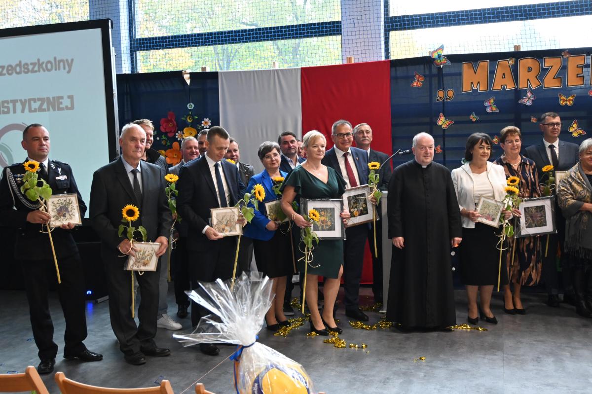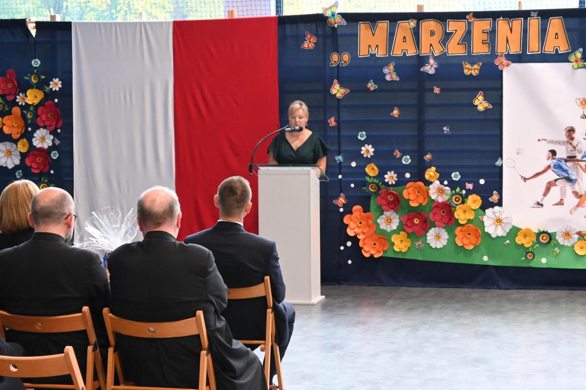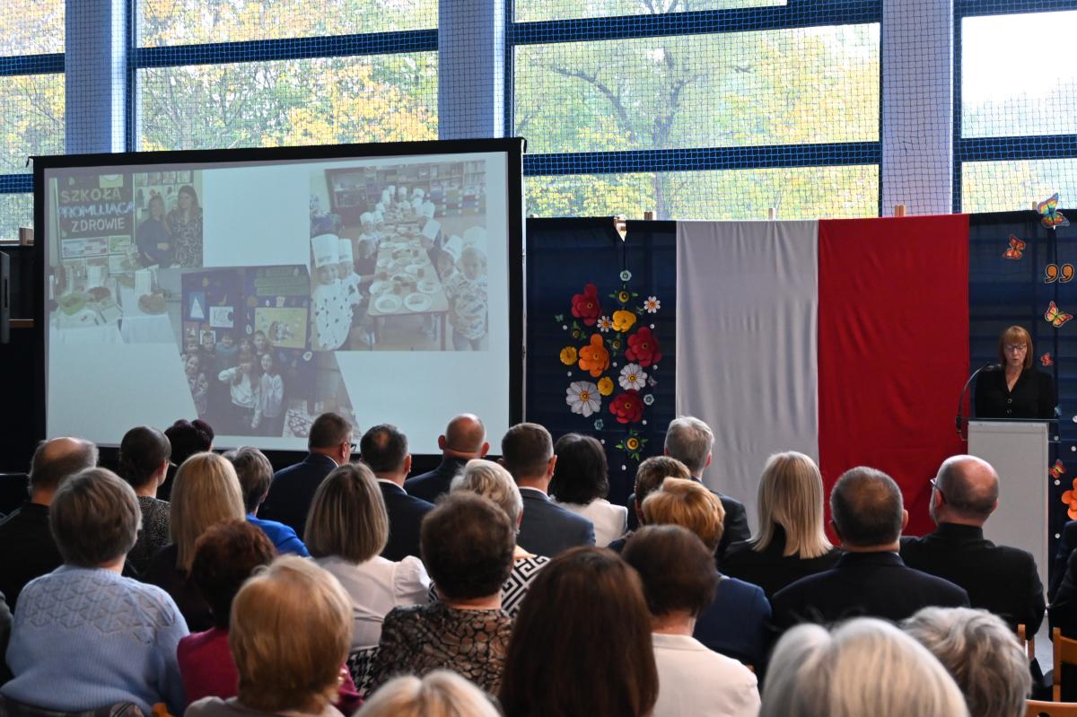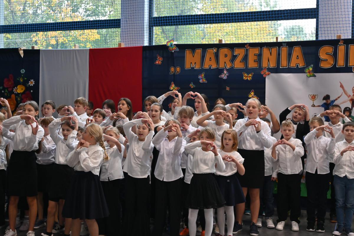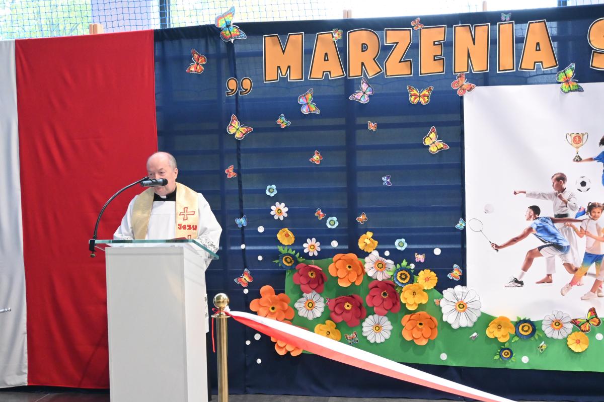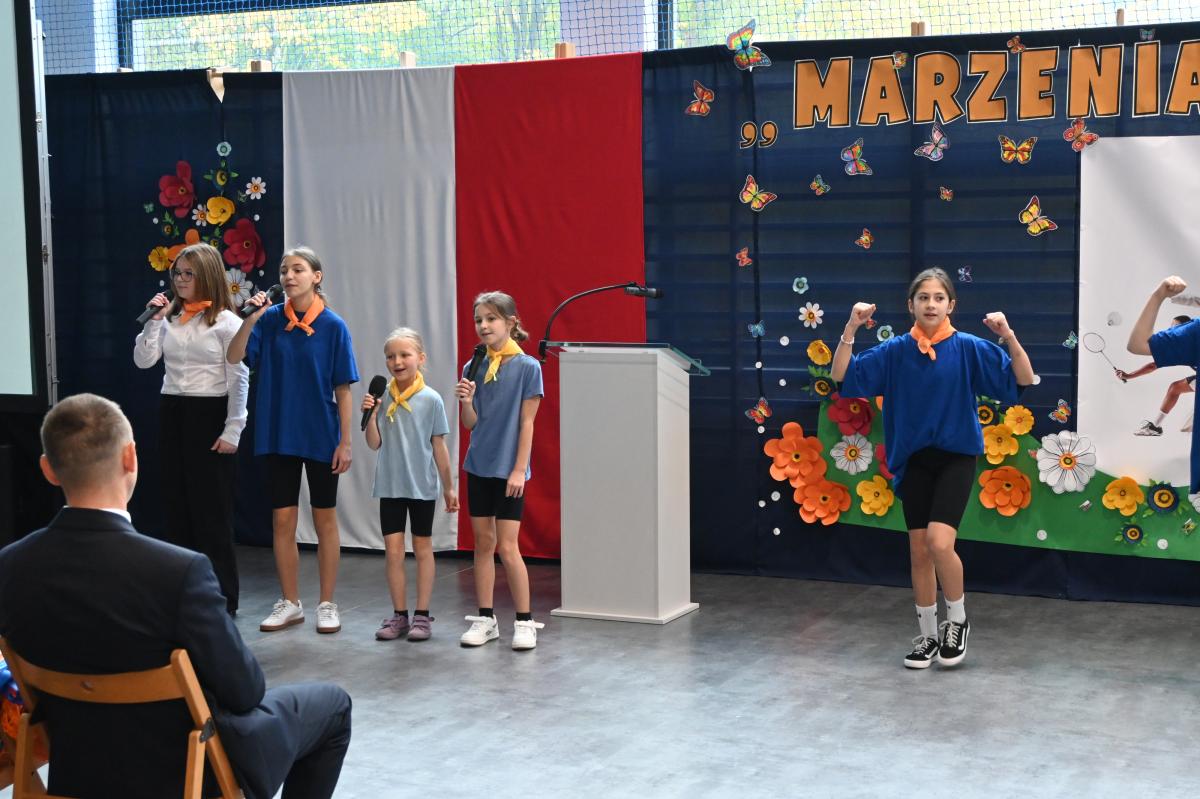 Cała społeczność szkolna czekała na ten moment. Nowa sala gimnastyczna jest oficjalnie otwarta! Czwartek 9 października 2025 roku zgromadził w naszej szkole wielu znakomitych gości. Zaszczycili nas swoją obecnością: pan Krzysztof Klęczar - wojewoda małopolski, pan Artur Pasek - pierwszy Małopolski Wicekurator Oświaty, pani Danuta Kawa - Radna Sejmiku województwa małopolskiego, pan Maksymilian Głowacz - Powiatowy Inspektor Nadzoru Budowlanego, pan Jan Najdek - Wójt Gminy Budzów, pani Janina Pieronkiewicz - sekretarz gminy Budzów, pani Kamila Nitecka przewodnicząca Rady Gminy, pan Maciej Krzyśków – Główny Specjalista w Wydziale Promocji, Kultury, Sportu i Funduszy, ks. Zbigniew Kaleciak - proboszcz parafii Budzów, ks. Piotr Derendal- wikariusz, sołtysi okolicznych wsi, pan Adam Liszka - wieloletni sołtys naszej wsi, radni powiatowi i gminni, zarząd OSP Baczyn oraz przedstawicielki KGW, dyrektorzy szkół podstawowych i przedszkoli samorządowych, pan Artur Świerkosz - wykonawca, a także rodzice i absolwenci. W części oficjalnej uroczystości Pani Dyrektor Teresa Gaura przywitała wszystkich zgromadzonych oraz wygłosiła piękne przemówienie. Ksiądz probosz poświęcił obiekt, a zaproszeni goście przecięli wstęgę. Później głos zabrali zaproszeni goście. Ostatnim punktem części oficjalnej było wprowadzenie flagi olimpijskiej oraz złożenie ślubowania przez przedstawicieli poszczególnych klas. Cześć artystyczną rozpoczęły prowadzące - Natalia i Julia, które sprawdziły się świetnie w roli konferansjerów. Następnie odbyły się prezentacje dyscyplin - akrobatyka, siatkówka, karate, piłka nożna, gimnastyka, poprzeplatane pięknymi rytmicznymi piosenkami. Występ uwieńczyła autorska piosenka, którą wykonali wszyscy uczniowie. Oczywiście był też czas na podziękowania, wpisy do księgi pamiątkowej oraz rozmowy.