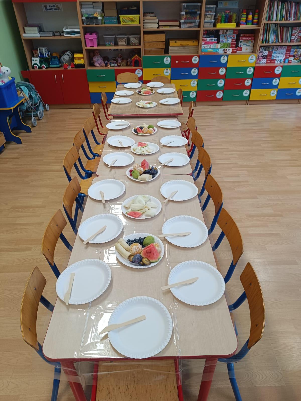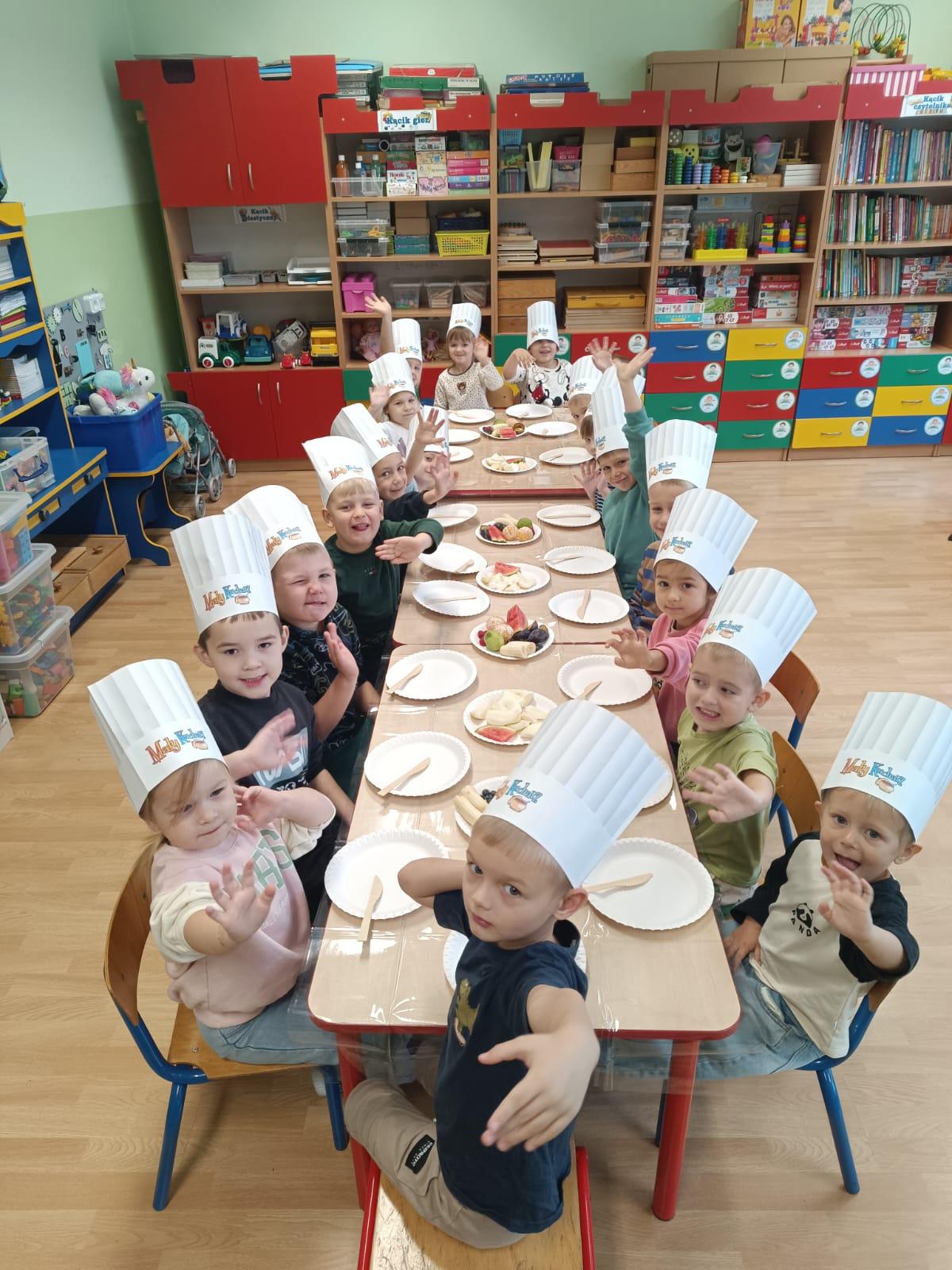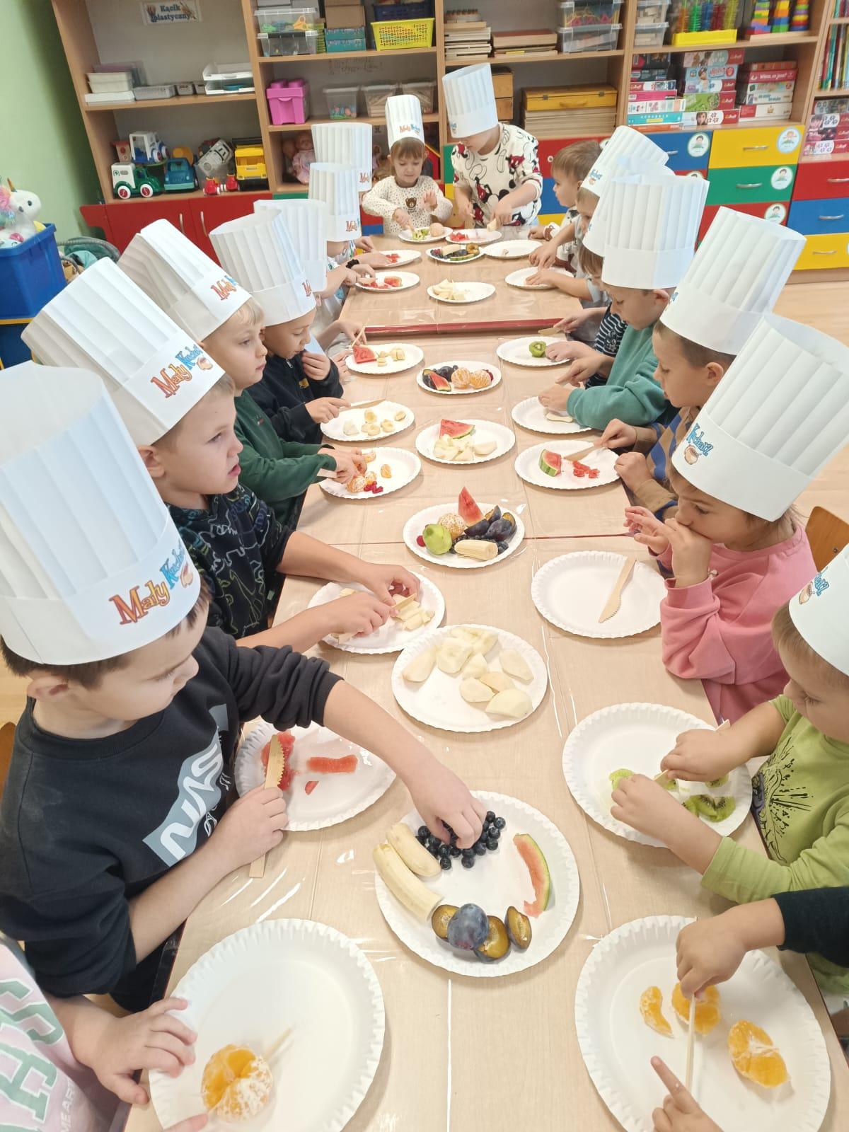 Podczas spotkania dzieci poznawały różnorodne smaki owoców oraz uczyły się, jak samodzielnie przygotować zdrową sałatkę owocową. Przedszkolaki miały okazję ćwiczyć krojenie owoców oraz komponowanie własnych, kolorowych i pysznych przekąsek. Zajęcia cieszyły się dużym zainteresowaniem i dostarczyły nam wiele radości oraz nowych umiejętności kulinarnych. :)