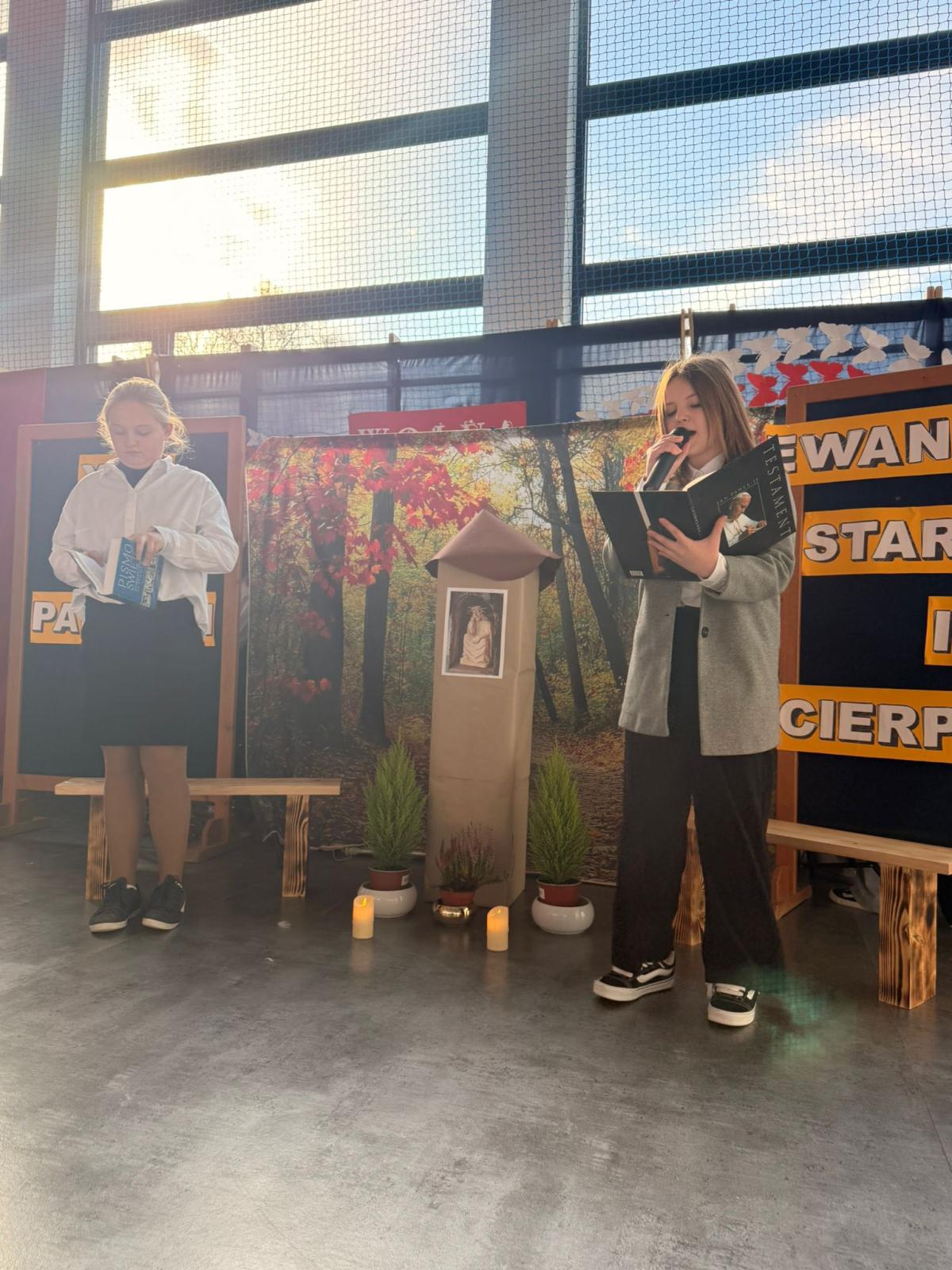 Dnia 12.11.2025r. w naszej szkole odbył się uroczysty apel poświęcony dwóm ważnym wydarzeniom: Narodowemu Świętu Niepodległości oraz XXV Dniowi Papieskiemu. Uroczystość rozpoczęła się od wspólnego odśpiewania Hymnu Narodowego i krótkiego przemówienia Pani Dyrektor, co wprowadziło wszystkich zgromadzonych w podniosły i refleksyjny nastrój.