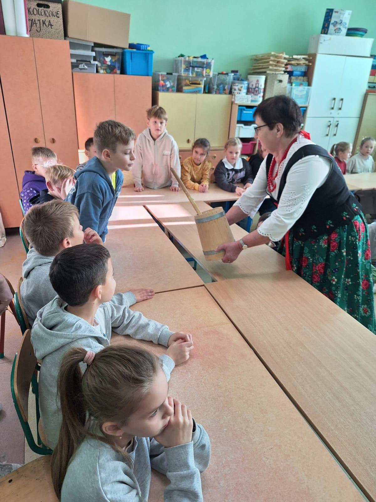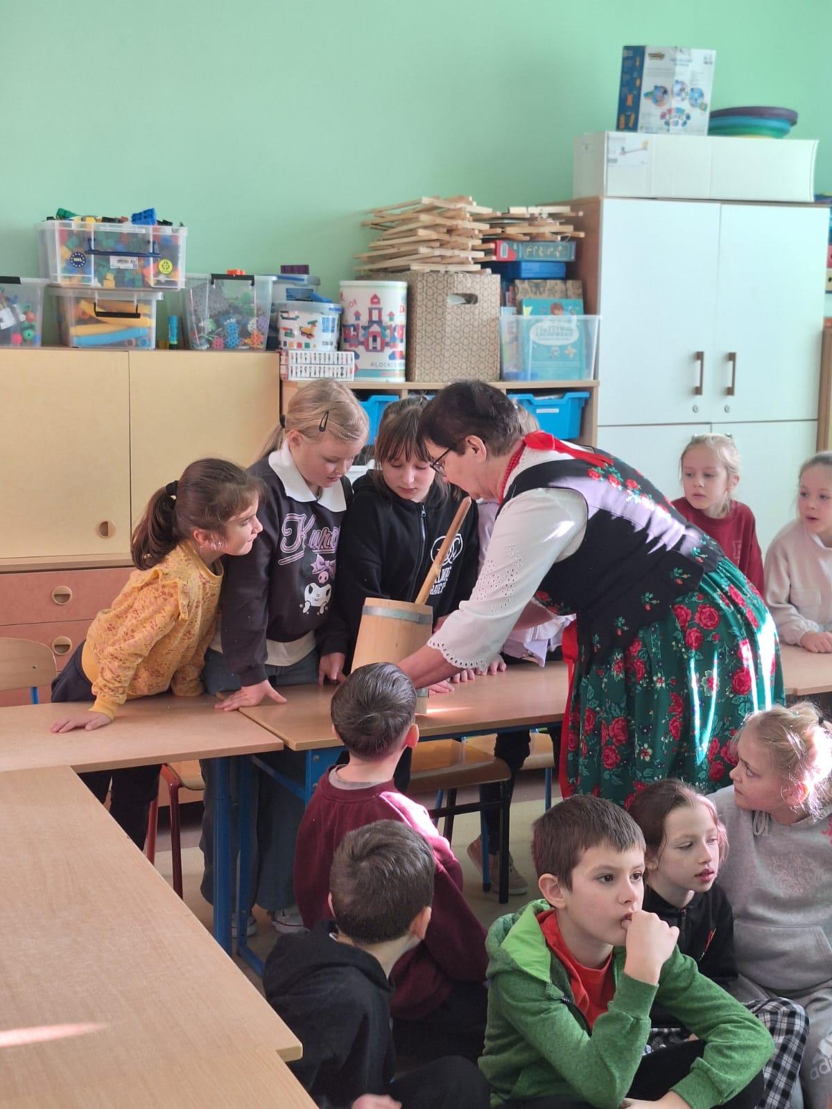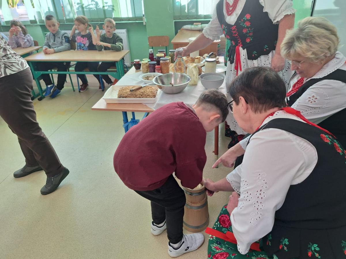 Gościnnie przyniesione produkty — śmietana, suszone grzyby, domowe przetwory oraz tradycyjna buchta — pokazały dzieciom, jak wyglądała kuchnia oparta na swojskich, naturalnych, pozbawionych konserwantów składnikach. Panie podkreślały, że dziś coraz częściej wracamy do takich właśnie smaków: prostych, zdrowych i przygotowywanych bez sztucznych dodatków. Przy okazji uczniowie dowiedzieli się również, jak dawniej przechowywano żywność bez lodówek — w chłodnych piwnicach, kamionkach, beczkach czy owiniętą w lniane ściereczki.