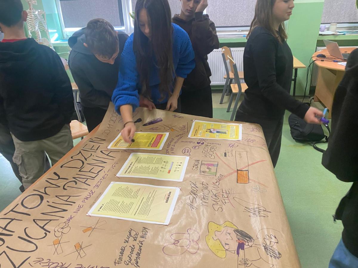 Po części teoretycznej uczniowie przystąpili do pracy plastycznej, tworząc plakaty ostrzegające przed szkodliwością palenia. W swoich pracach wykorzystali hasła i grafiki promujące zdrowie, zwracając uwagę na konsekwencje zdrowotne oraz społeczne wynikające z uzależnienia od nikotyny.