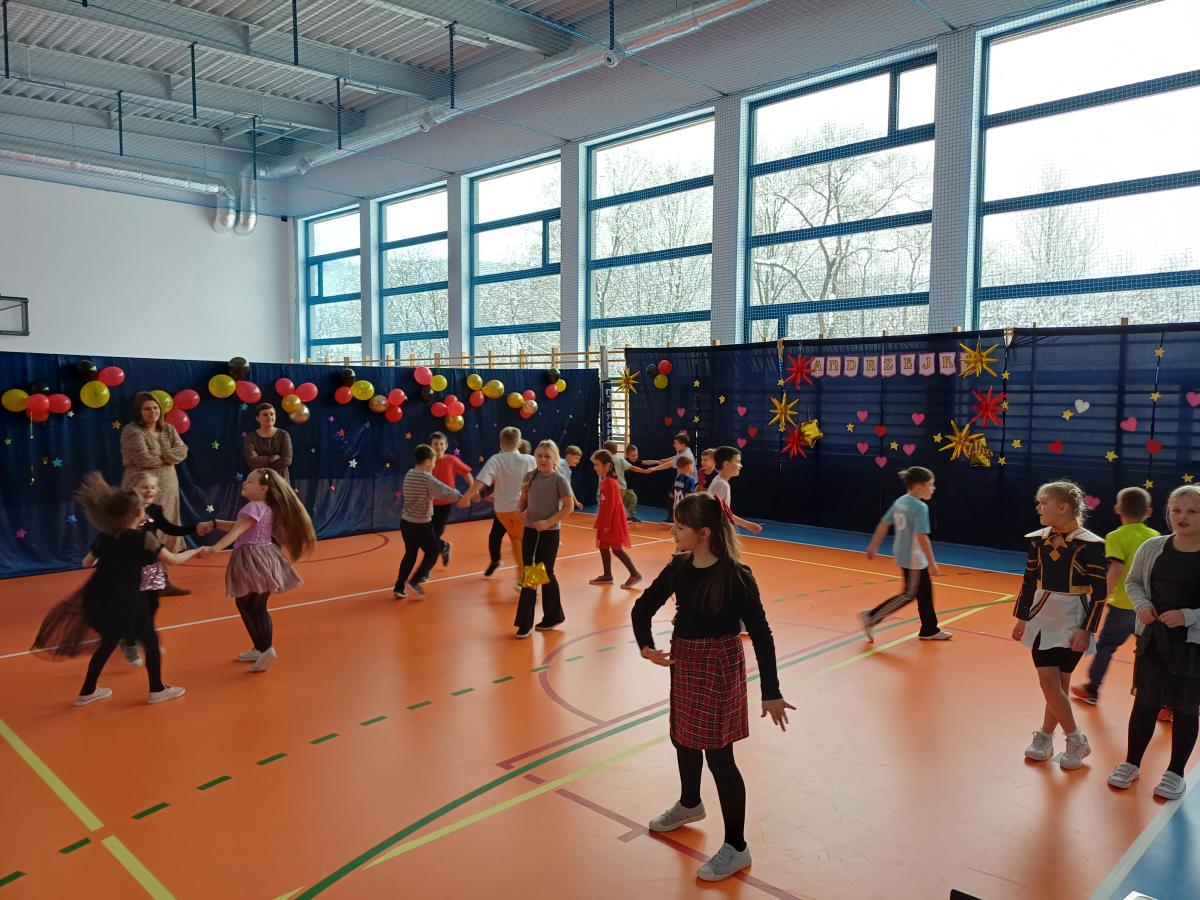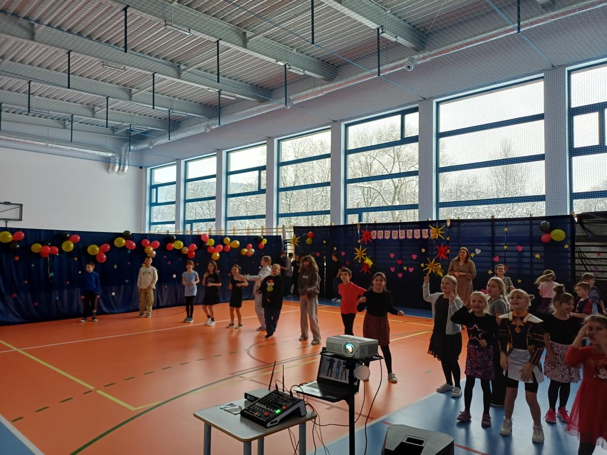 Kulminacyjnym punktem wydarzenia była wspaniała zabawa andrzejkowa, która po raz pierwszy odbyła się na naszej nowej sali gimnastycznej. Uczniowie brali udział w różnorodnych grach i konkurencjach ruchowych, takich jak odbijanie balonu w parach za pomocą kartki gazety, zabawy z chustą animacyjną czy przenoszenie piłeczek pingpongowych przy użyciu dwóch słomek. Śmiech i dobra energia towarzyszyły zabawie od początku do końca.