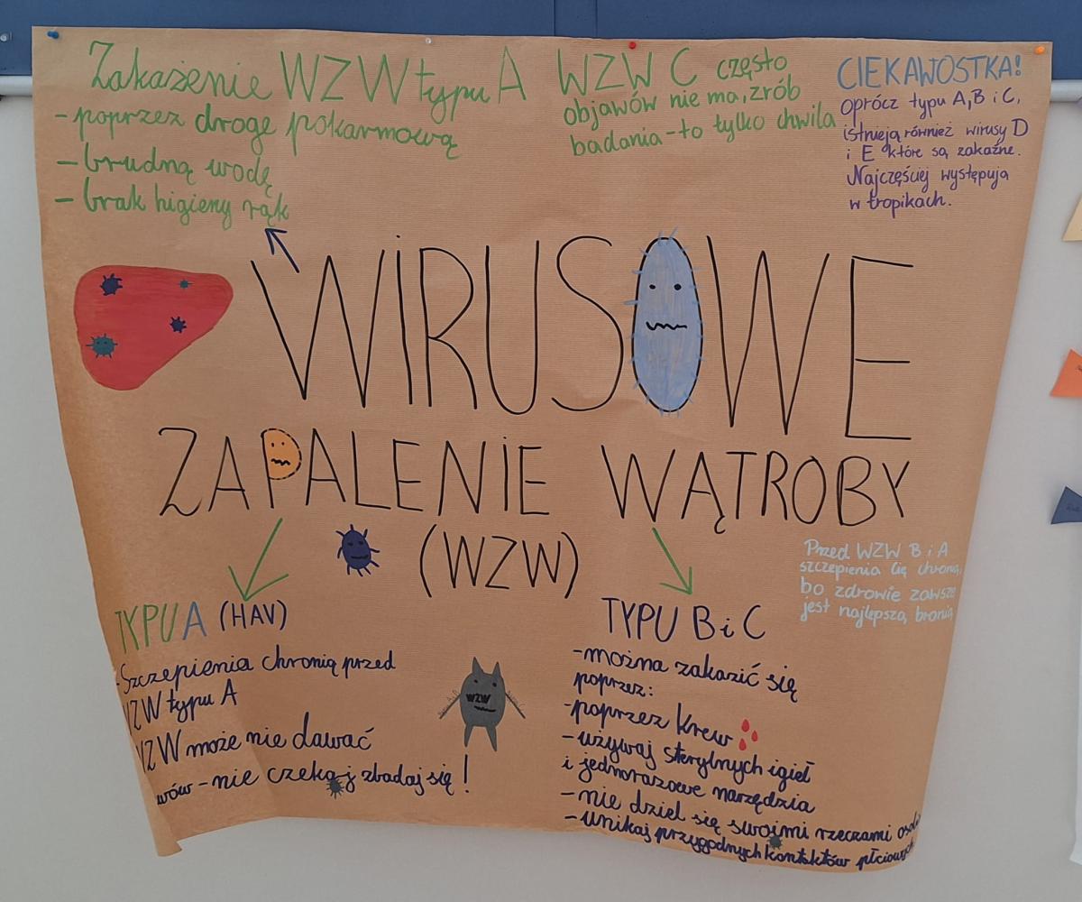 W ramach podsumowania tematu uczniowie pracowali w grupach nad wykonaniem plakatów edukacyjnych. Każda grupa opracowała różne zagadnienia, m.in. rodzaje WZW, sposoby przenoszenia wirusa, objawy choroby oraz metody zapobiegania zakażeniom. Przygotowane plakaty były estetyczne i bogate w wartościowe informacje.