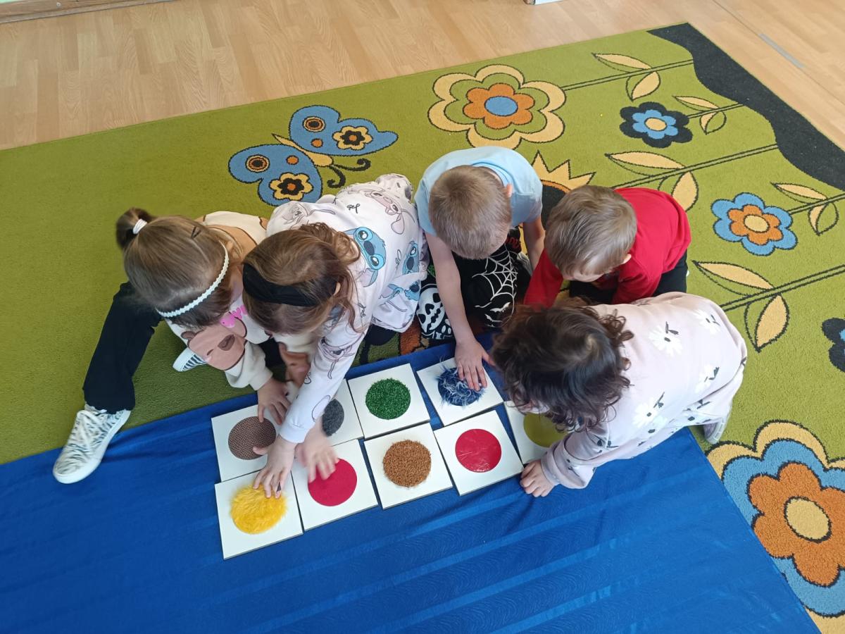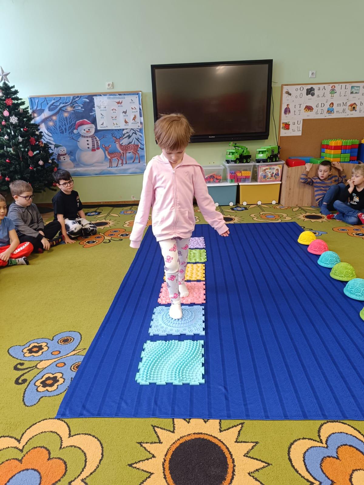 W przedszkolu zrealizowano zajęcia sensoryczne w ramach działań wspierających rozwój integracji sensorycznej dzieci. Podczas zajęć uczestniczyli w przejściu ścieżki sensorycznej, składającej się z kamieni sensorycznych o zróżnicowanej fakturze oraz paneli sensorycznych. W dalszej części zajęć miały możliwość poznawania i różnicowania bodźców dotykowych poprzez manipulowanie pomocami sensorycznymi, takimi jak piłki, kule, wałki oraz inne materiały o zróżnicowanej strukturze. Zajęcia przyczyniły się do stymulowania zmysłu dotyku oraz rozwijania koordynacji sensoryczno-motorycznej.
