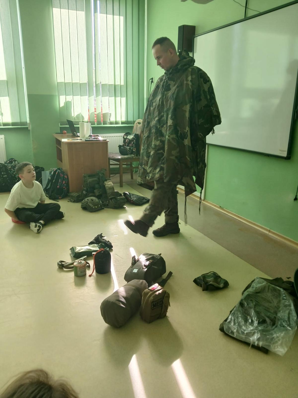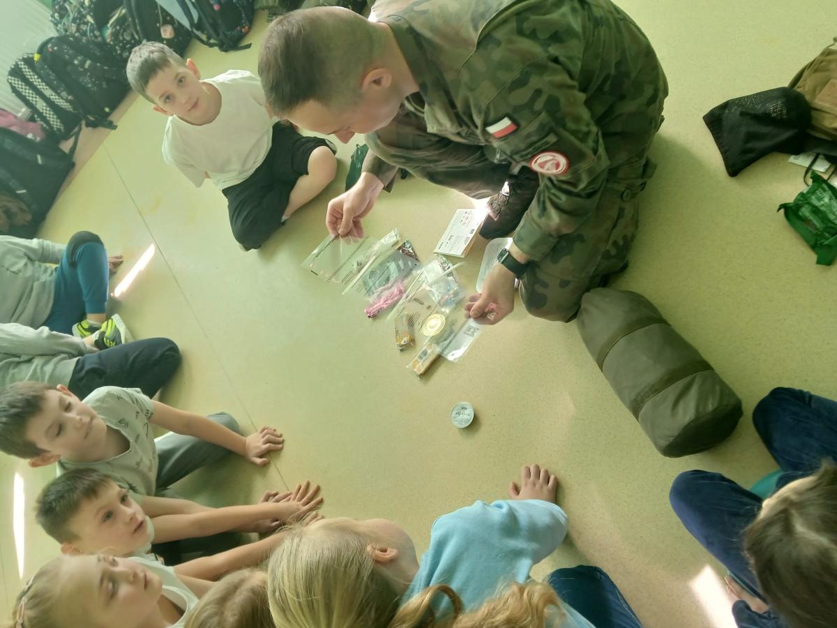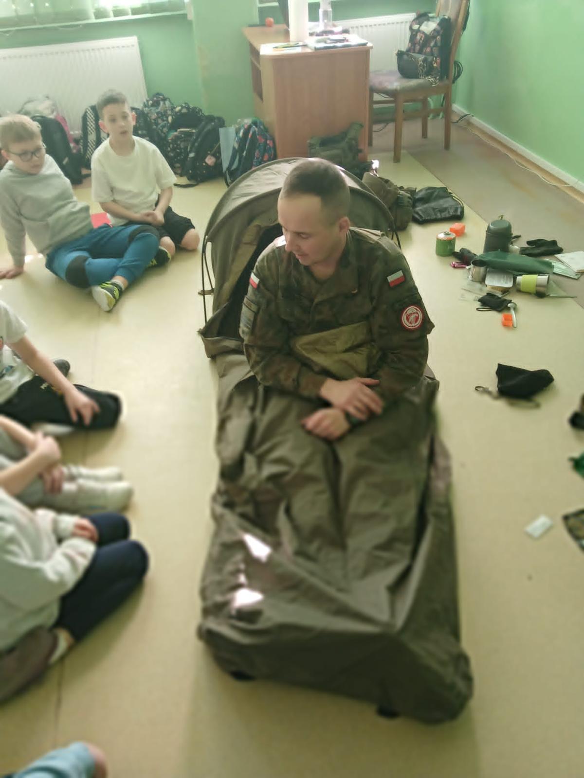 27 lutego 2026r. odbyło się kolejne spotkanie uczniów klasy II z żołnierzem w ramach innowacji „Mały patriota i wielki mundur- cykl spotkań z żołnierzem RP”. Podczas drugiej wizyty starszy kapral Tomasz Jopek opowiedział uczniom jak ważna jest sprawność fizyczna w pracy żołnierza. Zaznajomił ich z działaniem kompasu oraz pokazał wyposażenie plecaka żołnierza podczas ćwiczeń i udziału w poligonach. Okazało się, że w plecaku mieści się bardzo dużo, a niektóre przedmioty wcale nie były oczywiste;) Uczniowie z zaciekawieniem uczestniczyli w spotkaniu, szczególną atrakcją była możliwość położenia się w "norce", czyli jednoosobowym, wojskowym namiocie.