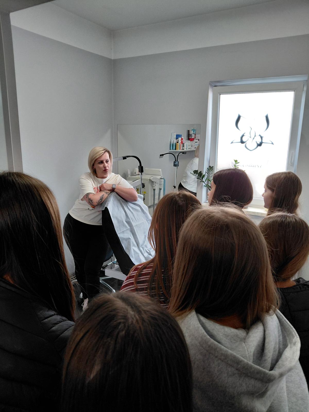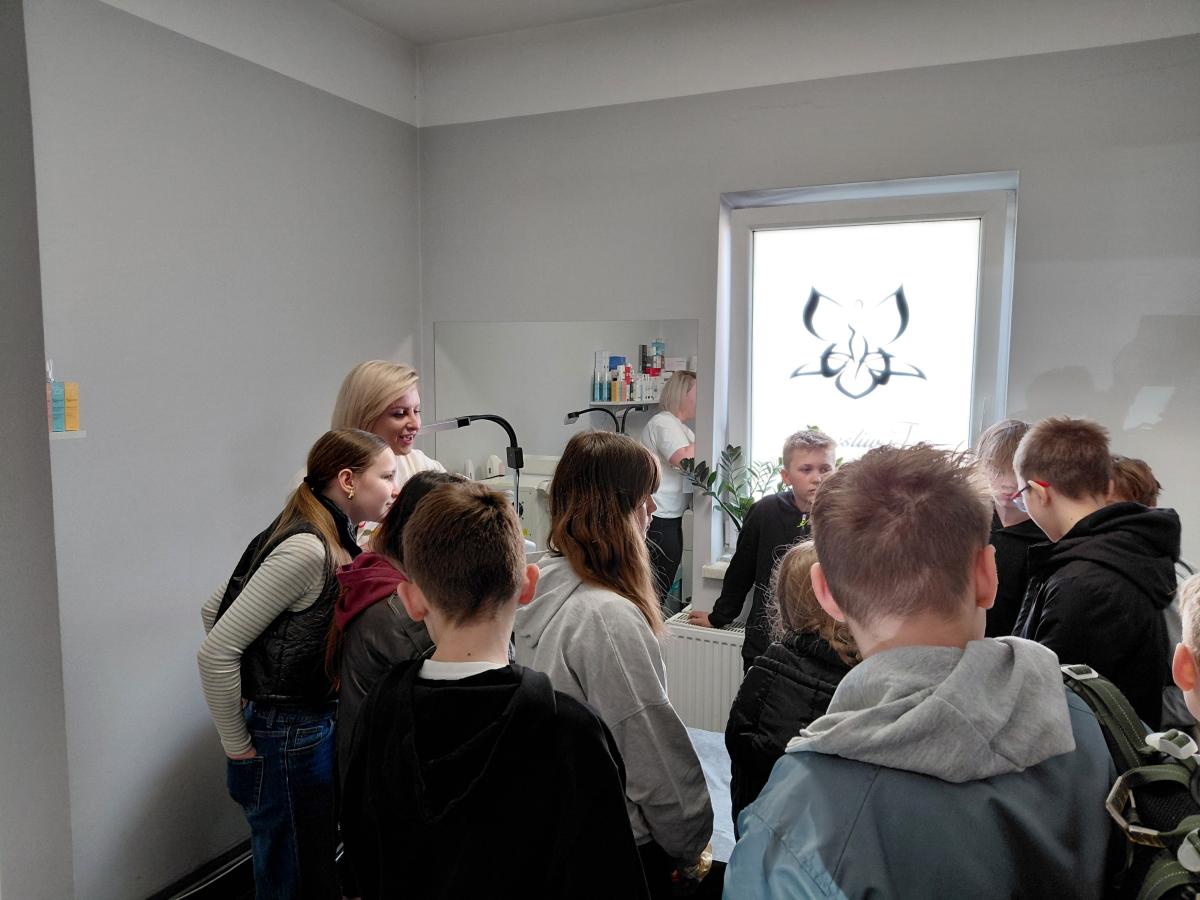 Podczas wizyty w Cechu Rzemiosł uczniowie poznali różne zawody oraz możliwości kształcenia w kierunkach rzemieślniczych. W salonie „Szczęśliwa TY” mogli zobaczyć, jak wygląda codzienna praca w branży beauty oraz jakie kompetencje są niezbędne do wykonywania tego zawodu.