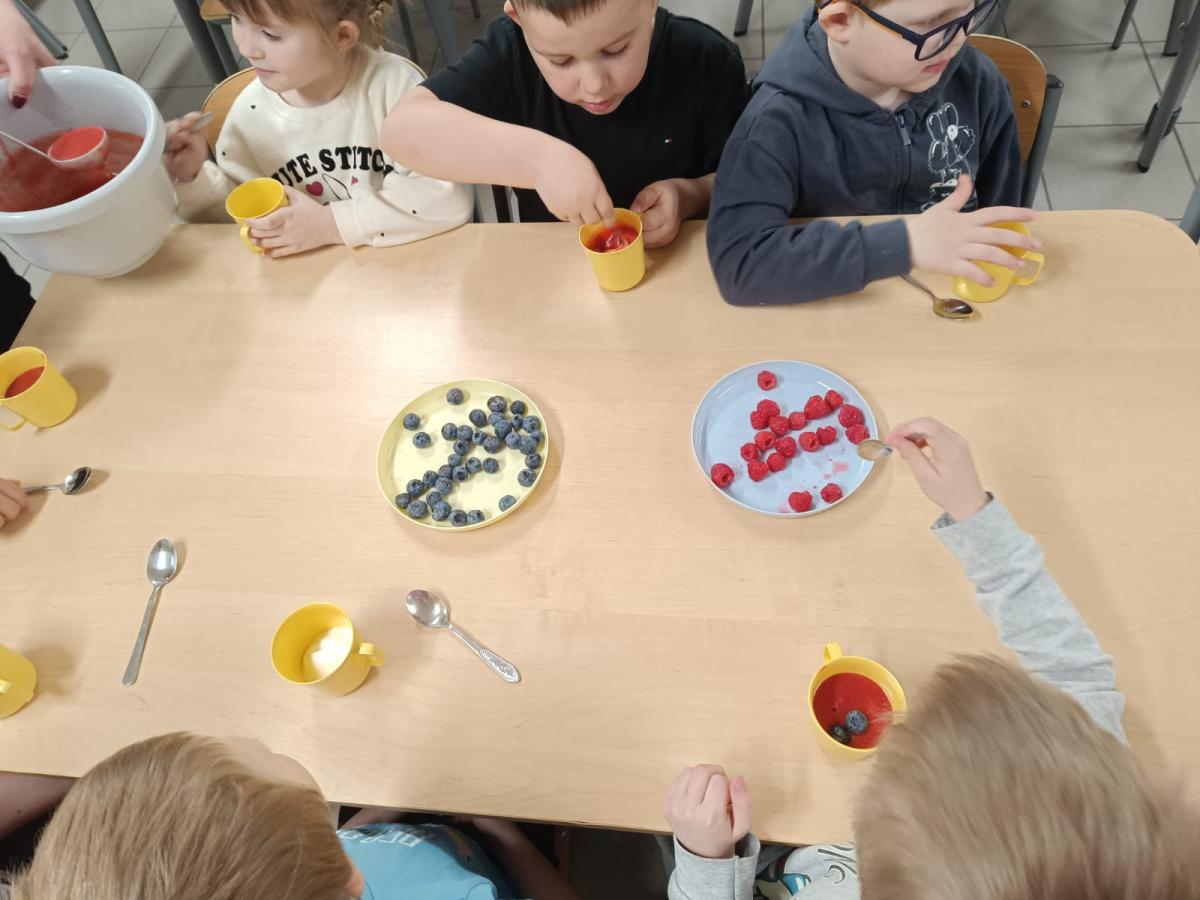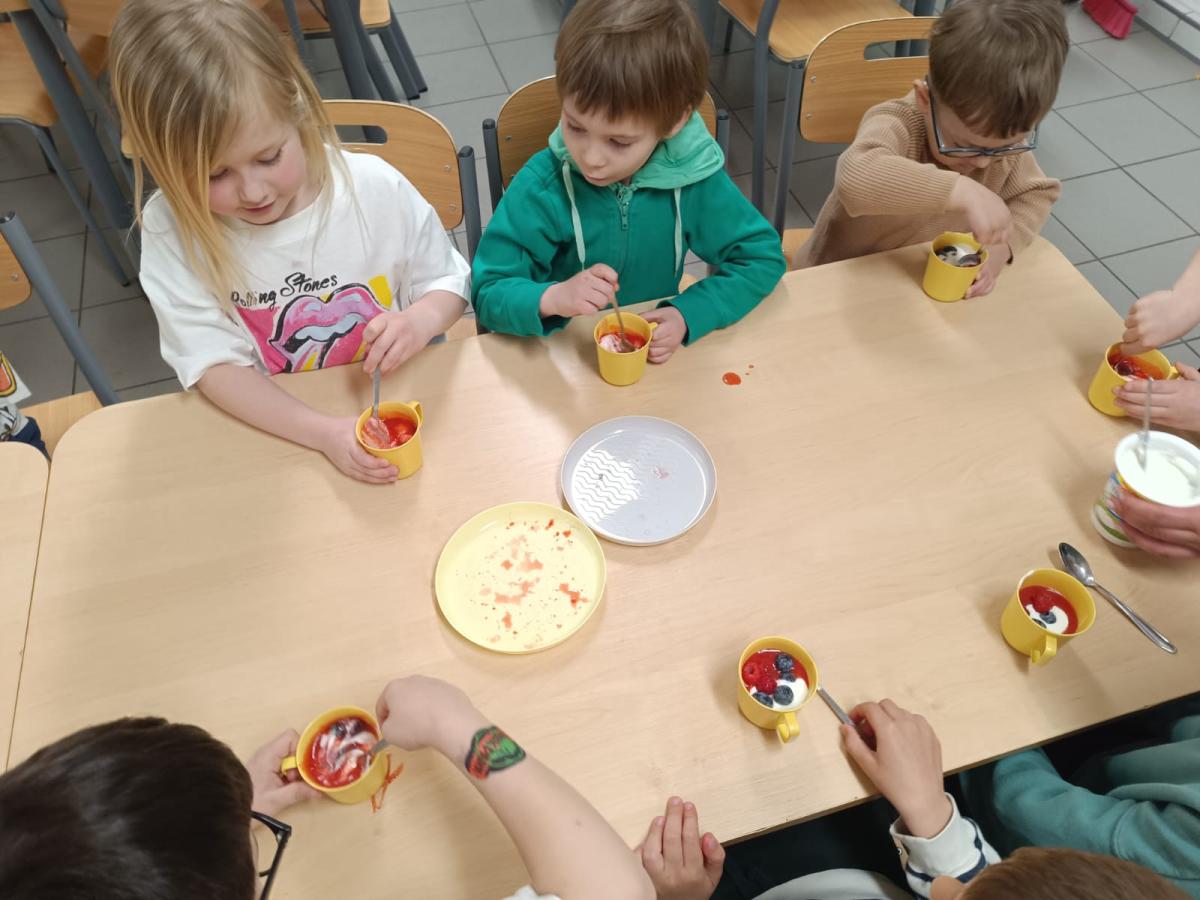 Przedszkolaki z ogromnym zaangażowaniem komponowały swoje deserki, rozwijając przy tym kreatywność oraz samodzielność. Nie zabrakło również rozmów o higienie i bezpieczeństwie podczas przygotowywania posiłków.