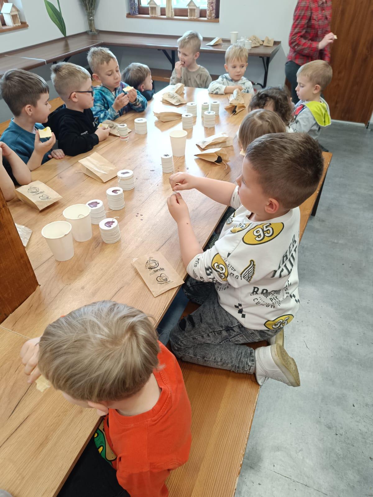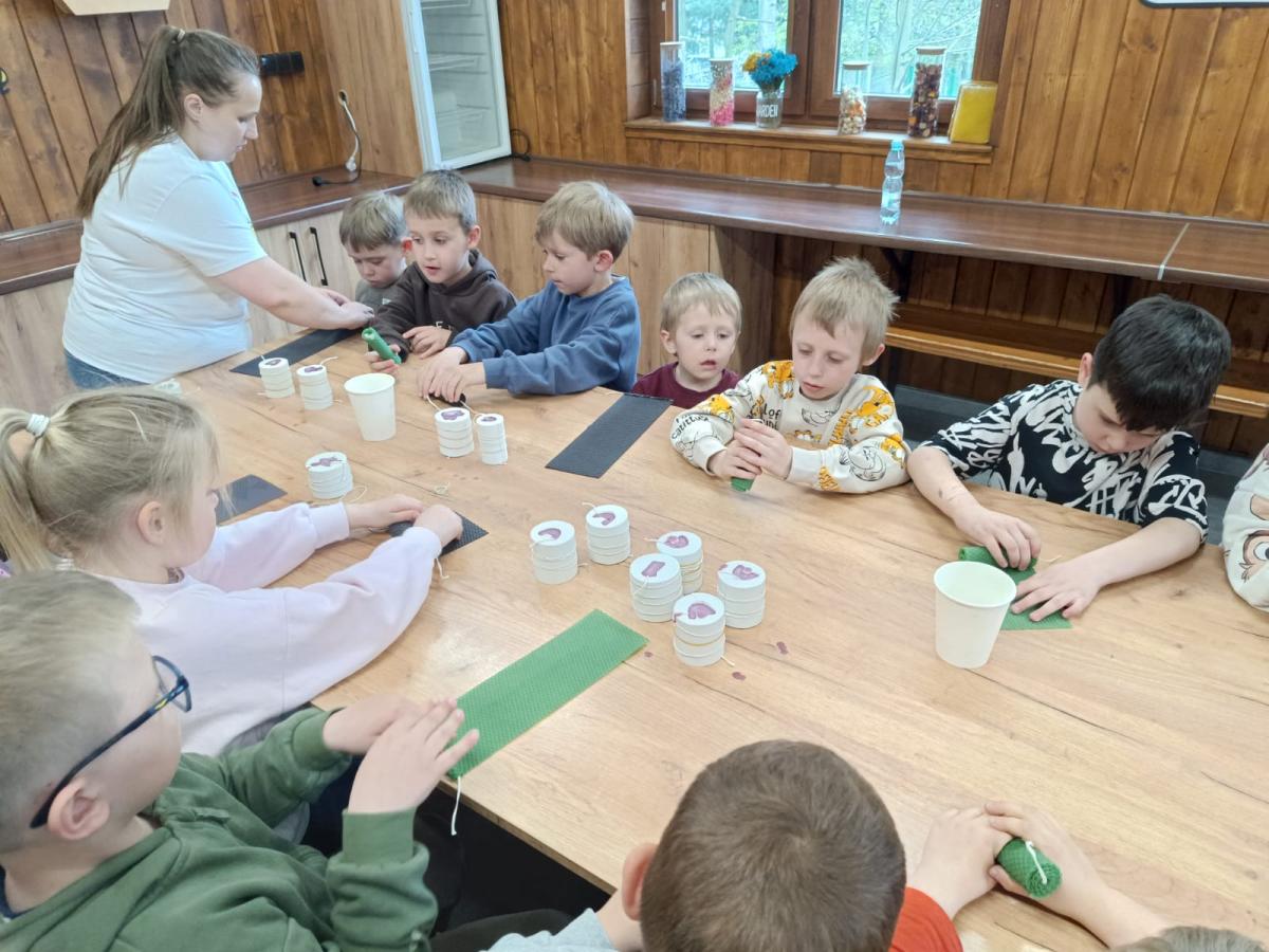 Po części edukacyjnej przyszedł czas na warsztaty, które sprawiły dzieciom ogromną radość – samodzielne tworzenie świec z wosku pszczelego. Każdy uczestnik mógł własnoręcznie wykonać świecę, którą następnie zabrał ze sobą na pamiątkę.