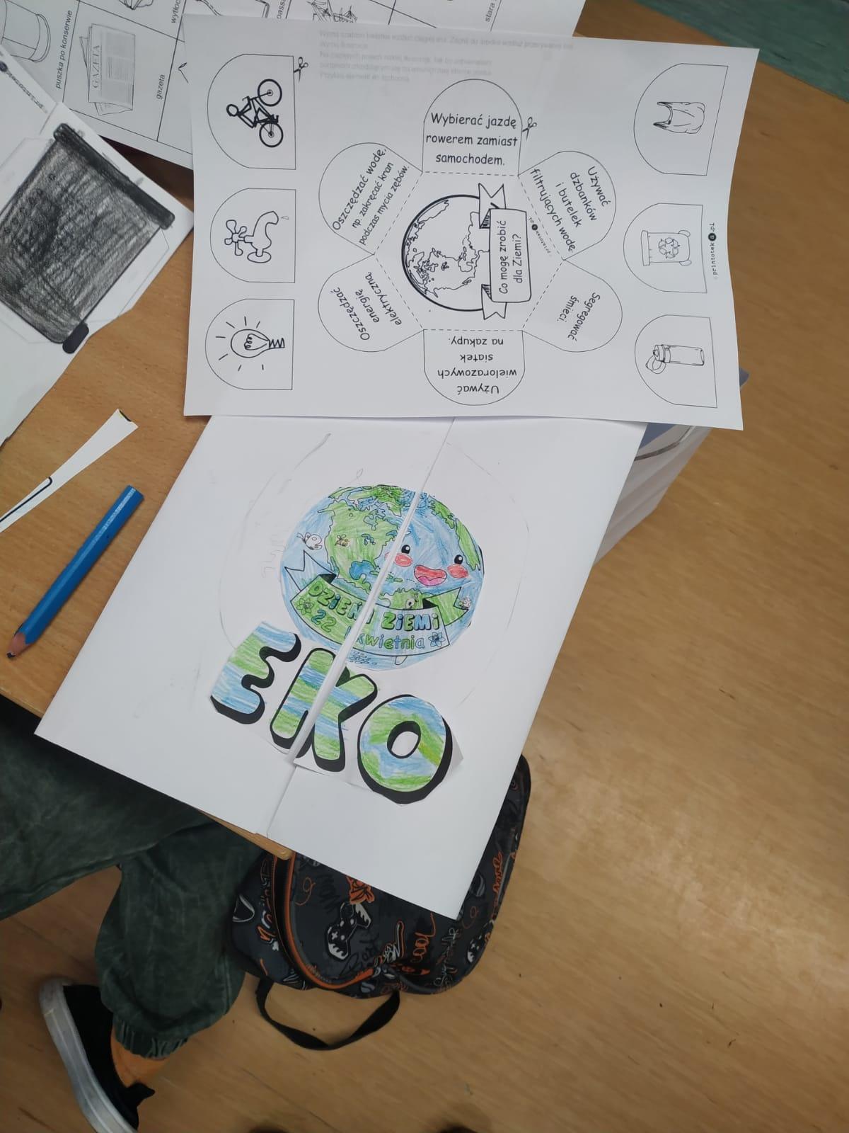 22 kwietnia 2026r. z okazji Światowego Dnia Ziemi uczniowie klasy pierwszej w ramach projektu edukacyjnego „Bezpiecznie i zdrowo z małpką Iwoną” wysłuchali wiersza o zwierzętach, które martwiły się o naszą planetę i dawały rady jak o nią dbać. Następnie wykonywali lapbooka ekologicznego w którym zawarte były najważniejsze informacje o segregacji śmieci oraz sposobach dbania o Ziemię. Zrobili również dwie karty pracy z projektu. Na koniec wyruszyli sprzątać teren wokół szkoły. Uczniowie byli bardzo zaangażowani podczas zajęć i nabyli wiele cennych informacji, aby zadbać o środowisko.
